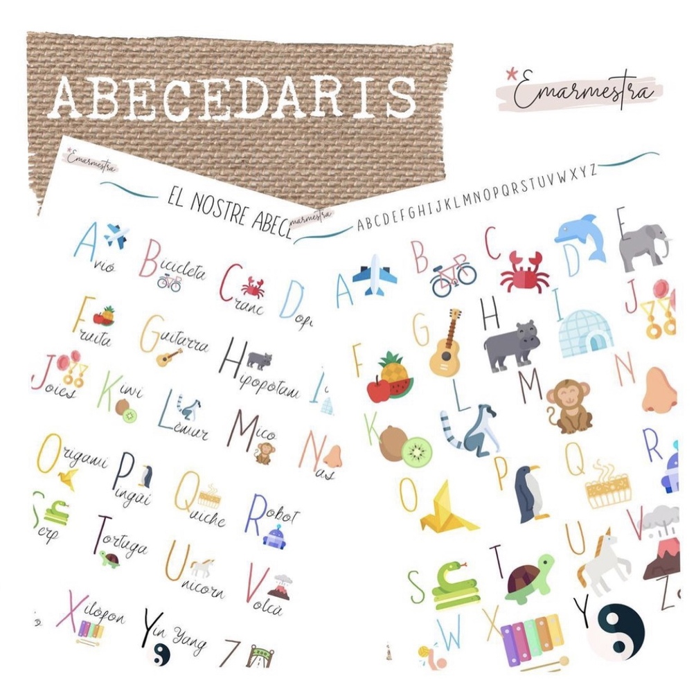 Pack de 6 abecedaris, en majúscula, minúscula i lletra lligada. Tres amb imatges i dos sense.